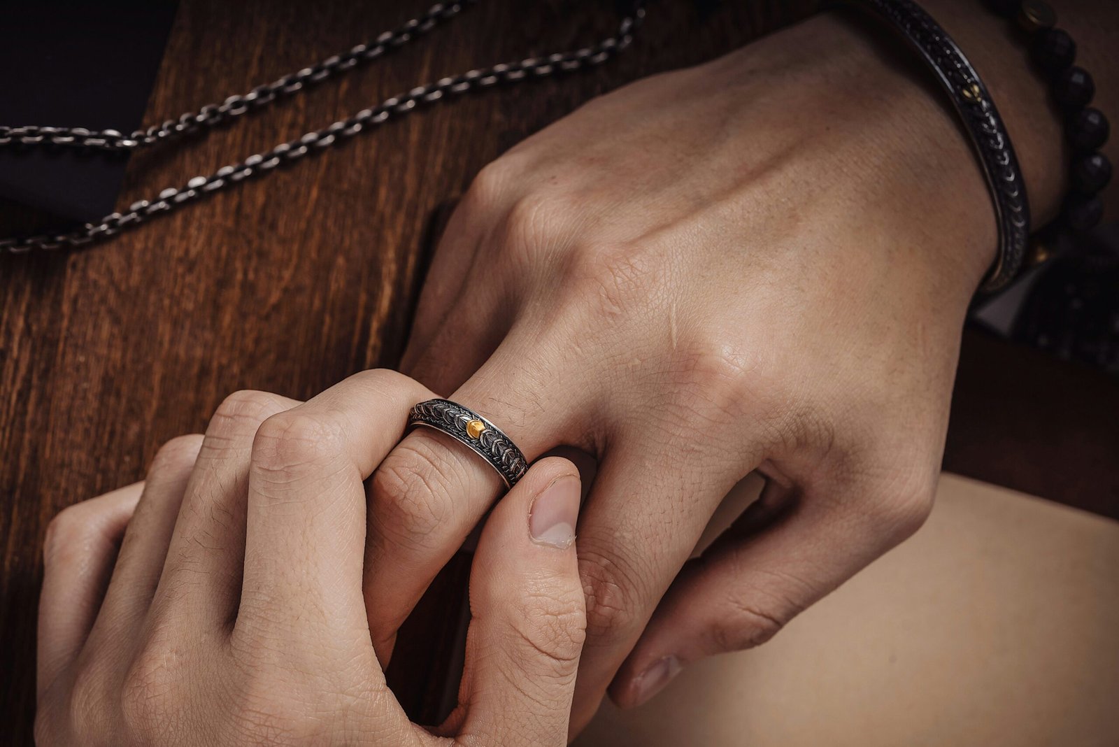 Coordinate color and scale when pairing a ring with Viking necklaces or bracelets. He should pick metals that either match (all silver or all bronze) or deliberately contrast (silver ring with leather bracelet) for visual balance. Keep widths proportional: a wide ring looks better with broader bracelets and thicker chains.